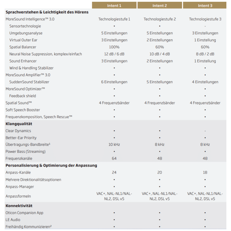 Oticon Intent ist ein diskretes, wiederaufladbares Hörsystem mit integrierter Telefonspule (T-Spule) und einfacher Bedienung über Tasten (optional). Es bietet Ihnen ein 360°-Hörerlebnis und verfügt über leistungsstarke Sensoren, die Ihre Hörabsicht erkennen und Ihnen ermöglichen, aktiver denn je am Leben teilzunehmen. Mithilfe der weltweit ersten 4D-Sensortechnologie sammelt das System Informationen aus Kopf- und Körperbewegungen, Gesprächsaktivitäten sowie aus der jeweiligen Klangumgebung. Darüber hinaus ist Oticon Intent mit Bluetooth®-Technologie ausgestattet, die hochwertiges Audio-Streaming und freihändiges Telefonieren ermöglicht.
